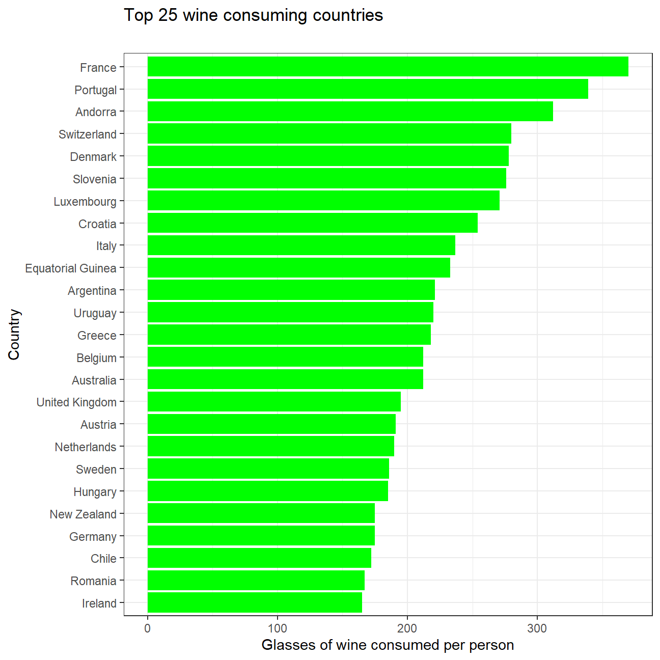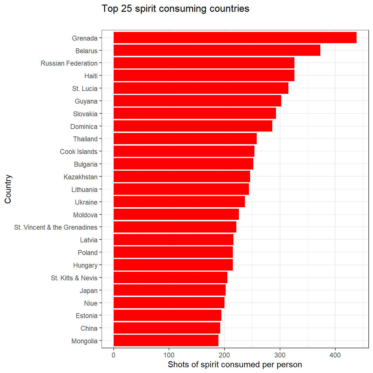 From the plots above, we can infer how heavily alcohol is being consumed in each country broken up into beer, wine and spirits. It is certainly no surprise that people in Czech are among the most beer-consuming countries, but Namibia is a little surprising with about 370 yearly beer cans consumed per person. That implies every person drinks on average about 1 beer per day. However, Namibia is a German colony and therefore has adopted the German Beer drinking traditions. A little surprising is the fact that Germany didn’t make it into the Top 3, but Gabon has. Regarding wine consumption, it is no surprise that people in France are the heaviest consumers having several world famous wineries. The average consumption is about 370 glasses of wine per person per year. Last but not least, Russia and Belarus are no surprise to be placed in the Top 3 spirit consumers with their popularity for drinking vodka, with about 370 and 320 shots of spirit consumed per person, respectively. A bit more interesting is Grenada leading the table, with approximately 430 servings per person, but a Caribbean country like itself probably has the right environment for a lot of rum drinking on the beach.